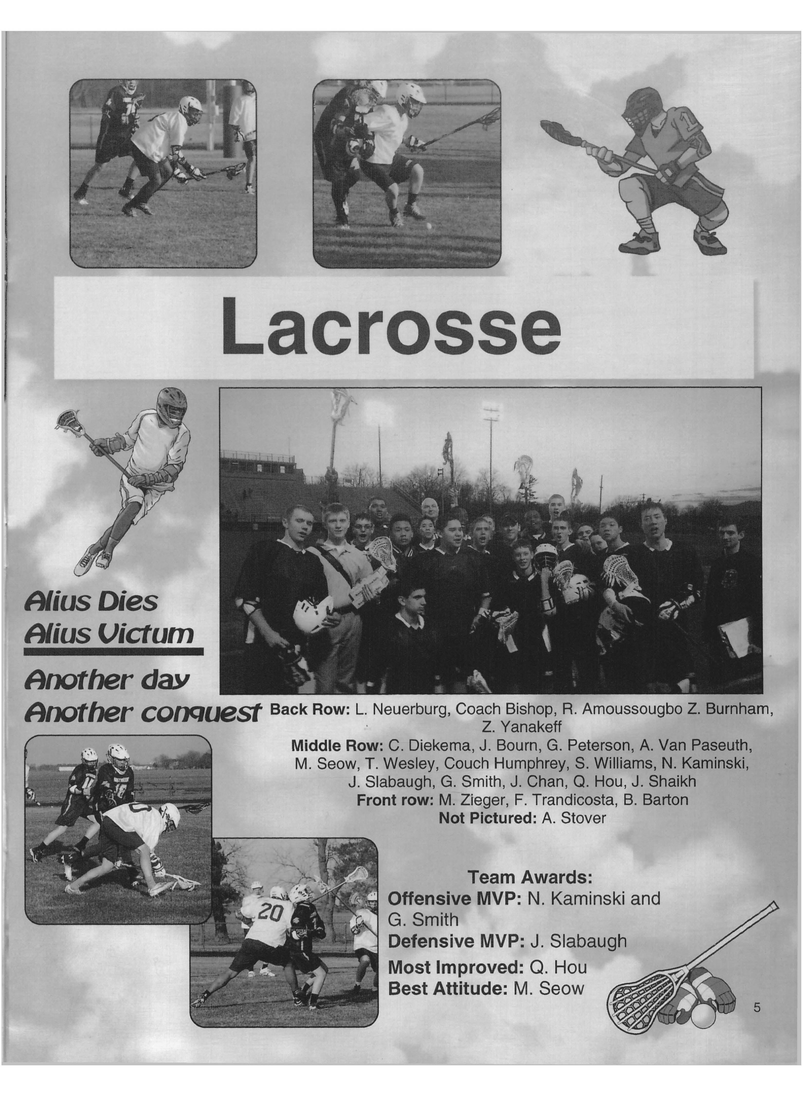 AliusDies Alius Victum AnotherdaY Lacrosse Another COIJCILJesf Back Row: L. Neuerburg, Coach Bishop, R. Amoussougbo z. Burnham, · Z. Yanakeff Middle Row: C. Diekema, J. Bourn, G. Peterson, A. Van Paseuth, M. Seow, T. Wesley, Couch Humphrey, S. Williams, N. Kaminski, J. Slabaugh, G. Smith, J. Chan, Q. Hou, J. Shaikh Front row: M. Zieger, F. Trandicosta, B. Barton Not Pictured: A. Stover Team Awards: " Offensive MVP: N. Kaminski and G. Smith Defensive MVP: J. Slabaugh Most Improved: Q. Hou Best Attitude: M. Seow 5