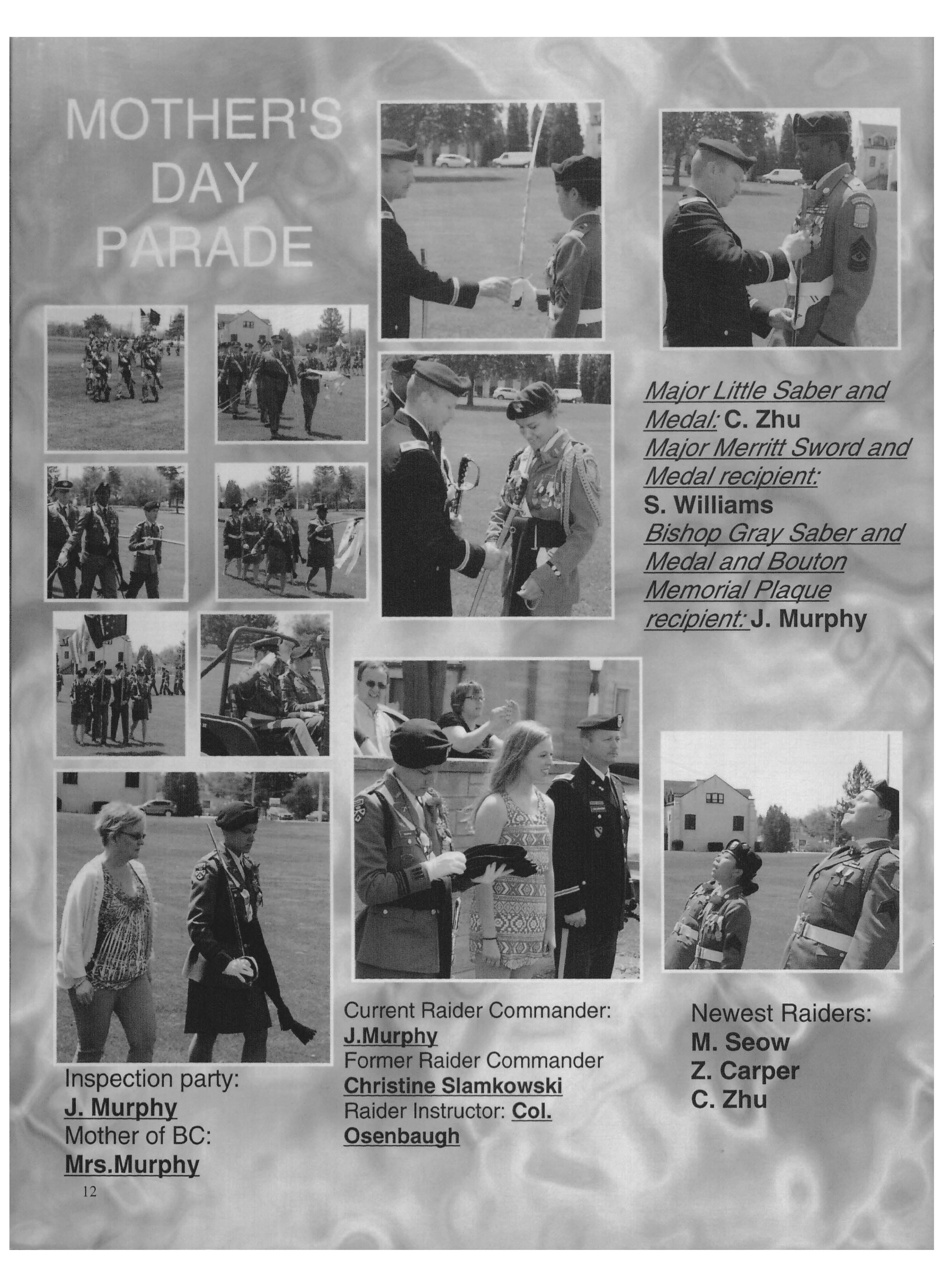 Inspection party: J. Murphy other of BC: rs.Murphy 12 nt Raider Commander: h aider Commander Ch e Slamkowski Raider Instructor: Col. Osenbaugh Major LiUle Saber and Medaf.·C. Zhu Major MerriU Sword and Medal reci Vent· S. Willia Saber and Meda and Boutoff.. Memorial Plaque reciDient·J. Murphy