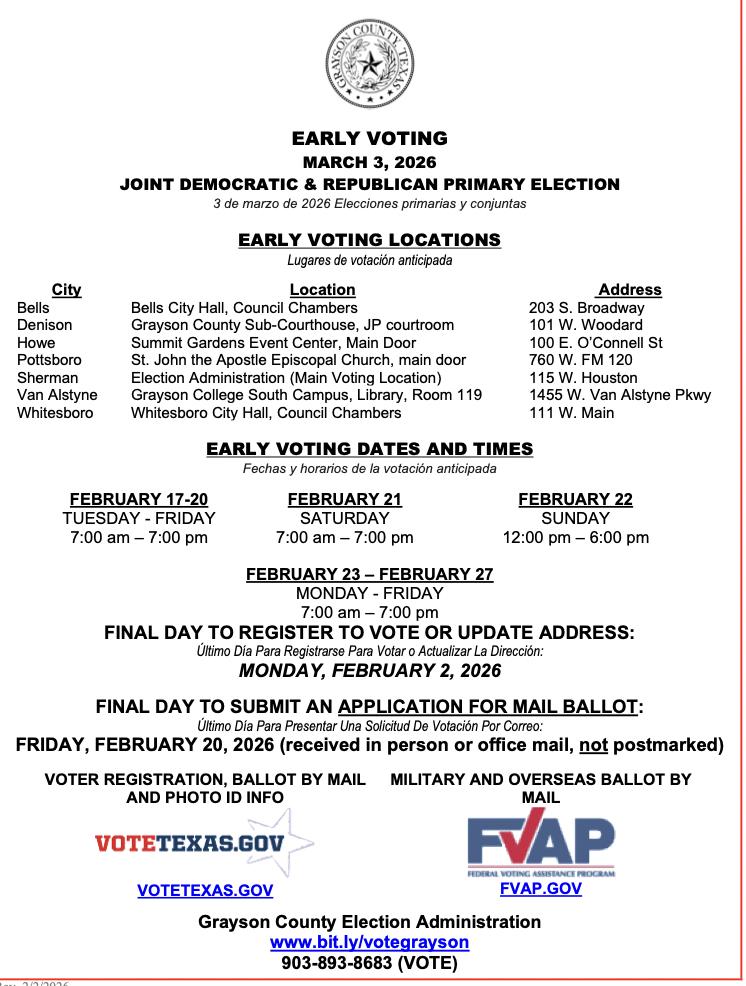 Thisweek,earlyvotingbeganinGraysonCounty.Moreinformationregarding votingwillbeincludedinnextweek’sedition.