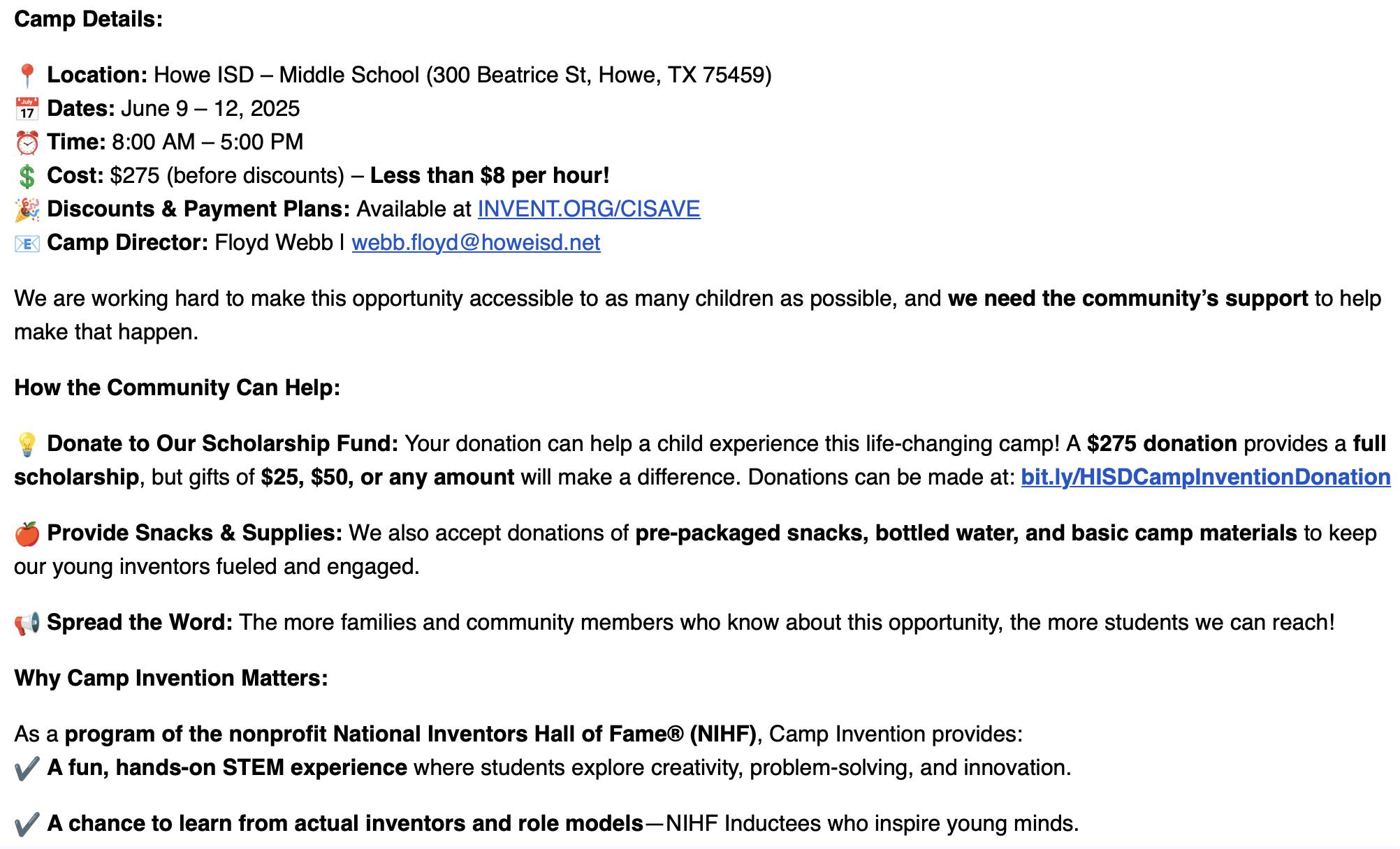 Thissummer,CampInvention®,anationallyrecognizedhands-onSTEM,innovation,andcreativitycamp,iscomingtoHoweMiddleSchoolforstudents ingradesK-6!