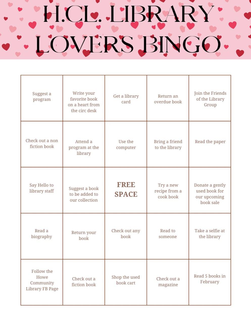 ComejoinusatHoweCommunity LibraryforLoveYourLibraryMonth. Bingowilllasttheentiremonthof February.