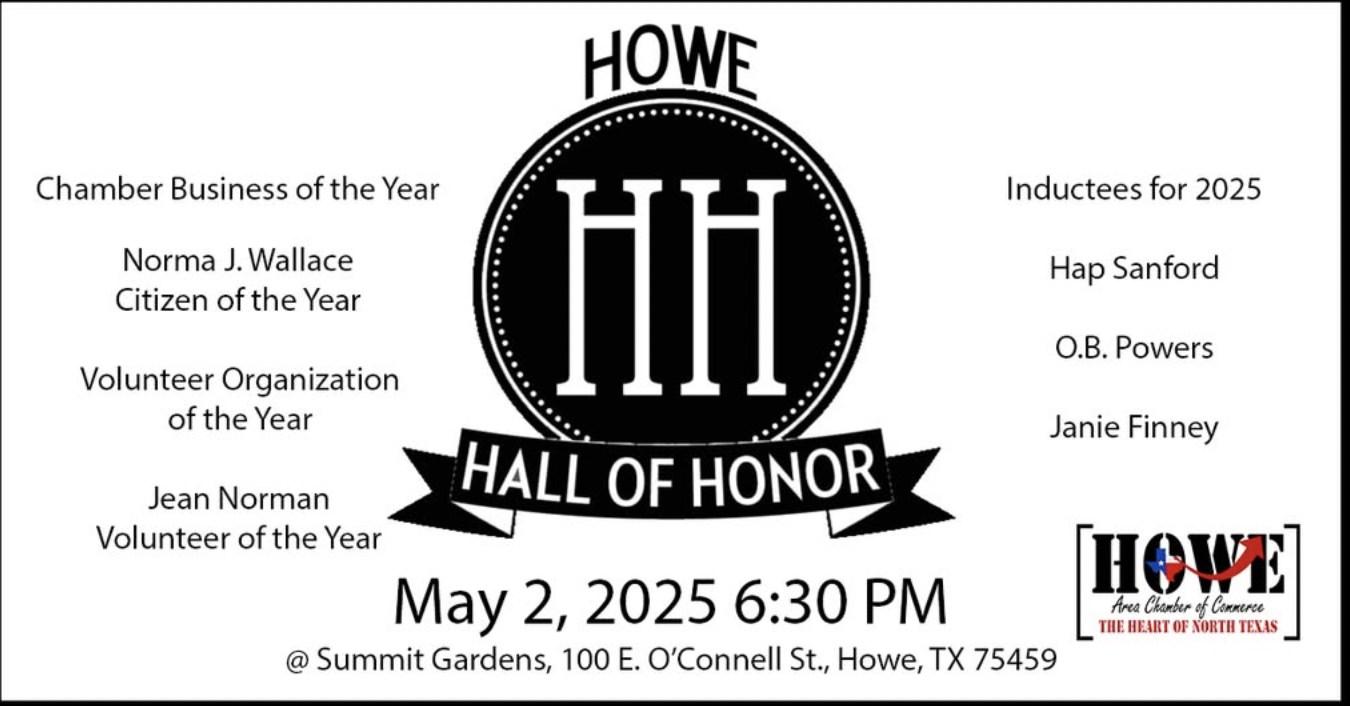 ThesewillberecognizedattheHoweHallofHonoronMay2,2025atSummitGardensat6:30pmalongwiththeHoweHallofHonorInducteesJanieFinney,O.B.Powers,andHapSanford.Thereisnochargetoattend,andseatingislimited.Reservationscanbemade at:Program:HoweHallofHonor2025