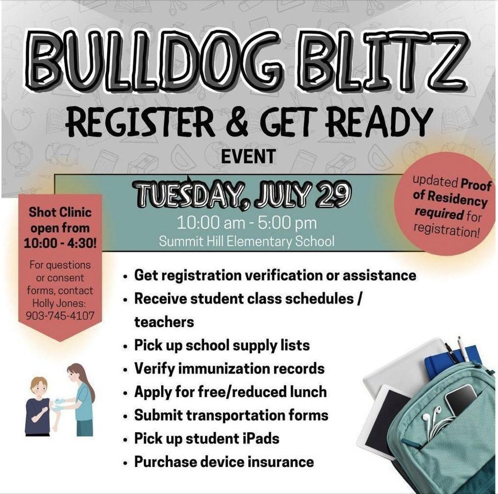 BulldogBlitzRegistrationEvent TheBulldogBlitzRegistrationEventisback!JoinusonTuesday,July29thfrom 10:00-5:00atSummitHillElementarytogetregistered,getschedulesandteacher assignments,pickupstudentdevices,andmore!Forquestions,pleasecontact ClarissiaDotyat903-745-4004.