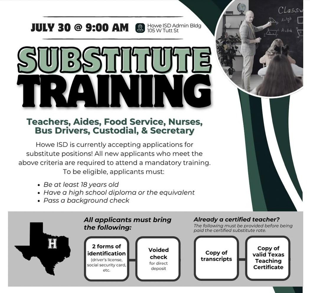 Wewillhostoursubstitutetrainingon Wednesday,July30attheHoweISD trainingroomlocatedat105W.Tutt.