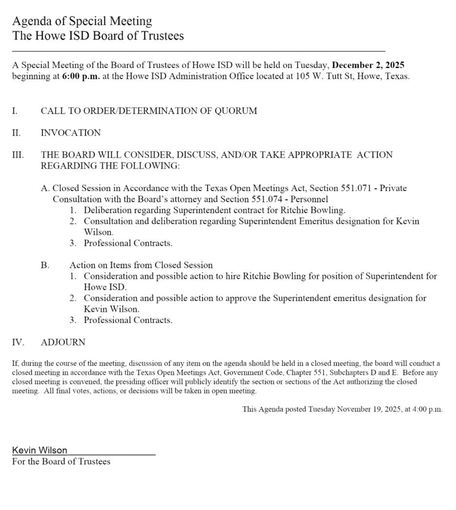 meetingcanbefoundonpage6of thispublication.Regularmeetings areheldeverythirdMondayofeach month,at6p.m.attheHoweISD Administrationofficeat105W.Tutt St.Howe,Tx.