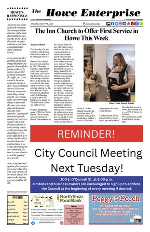 The City of Howe had two treacherous roads surfaced last week, one stretch reworked in June, three more currently under construction, and one more that hasn’t started yet. W. Young Street, on the west side of US Highway 75, and connecting the southern portion of Smith Road A Twitter, er uh, X video was paved with asphalt last week thanks to a post from @SpartaJustice on Nov. development agreement 8, 2023 has not garnered with Rockhill Capital & Investments and the City 6.6 million views. The of Howe. The asphalt title of the post is THE sections will eventually COUP DE'TAT OF AMERICA: Italian Intel- become concrete as each development phase ligence along with U.S. sworn testimony confirms progresses. the 2020 U.S. PresidenThe stretch of potholes tial Election was stolen (Continued on page 6) that ran directly in front of Bethel Baptist Church EDITOR’S NOTE—This column is on Ponderosa Road was reserved as an editorial column and resurfaced recently. The may not necessarily reflect the policy of this publication. section of Young Street between Hughes Street INSIDE and Denny Street is City Sales Tax, pg. 4 currently under Caden Garner VP, pg. 5 School Board Agenda, pg. 5 construction with a rock City Council Agenda, pg. 6 Crazy Conspiracy Articles, pg. 7 overlay which will be surfaced upon the FBC XYZ, pg. 8 Hot Jobs, City Info, pg. 9 completion of the gas History/Christian, pg. 10 line installations in that Local Churches, pg. 11 Chamber Members, pg. 12 area. Past front pages, 13-20