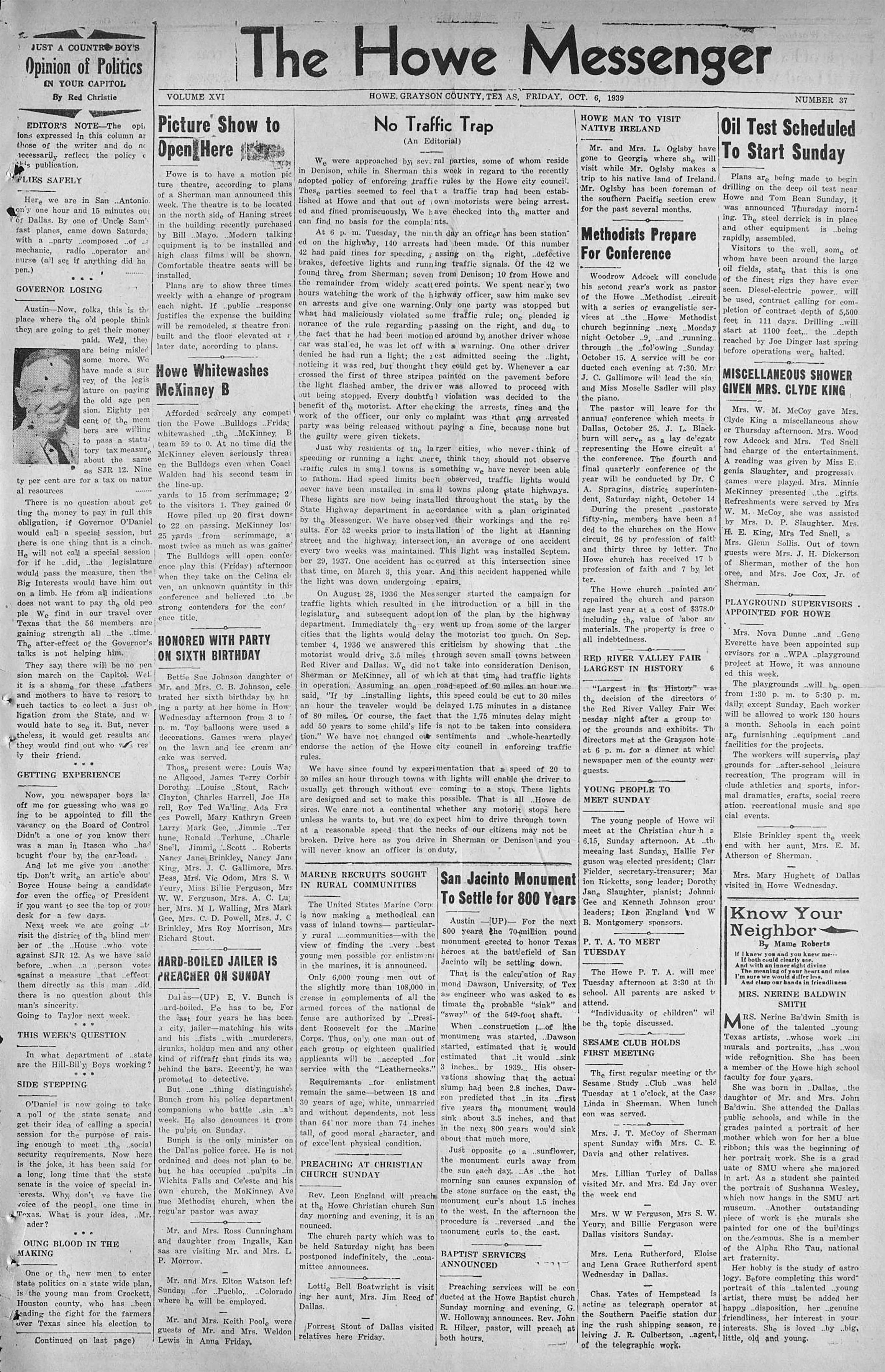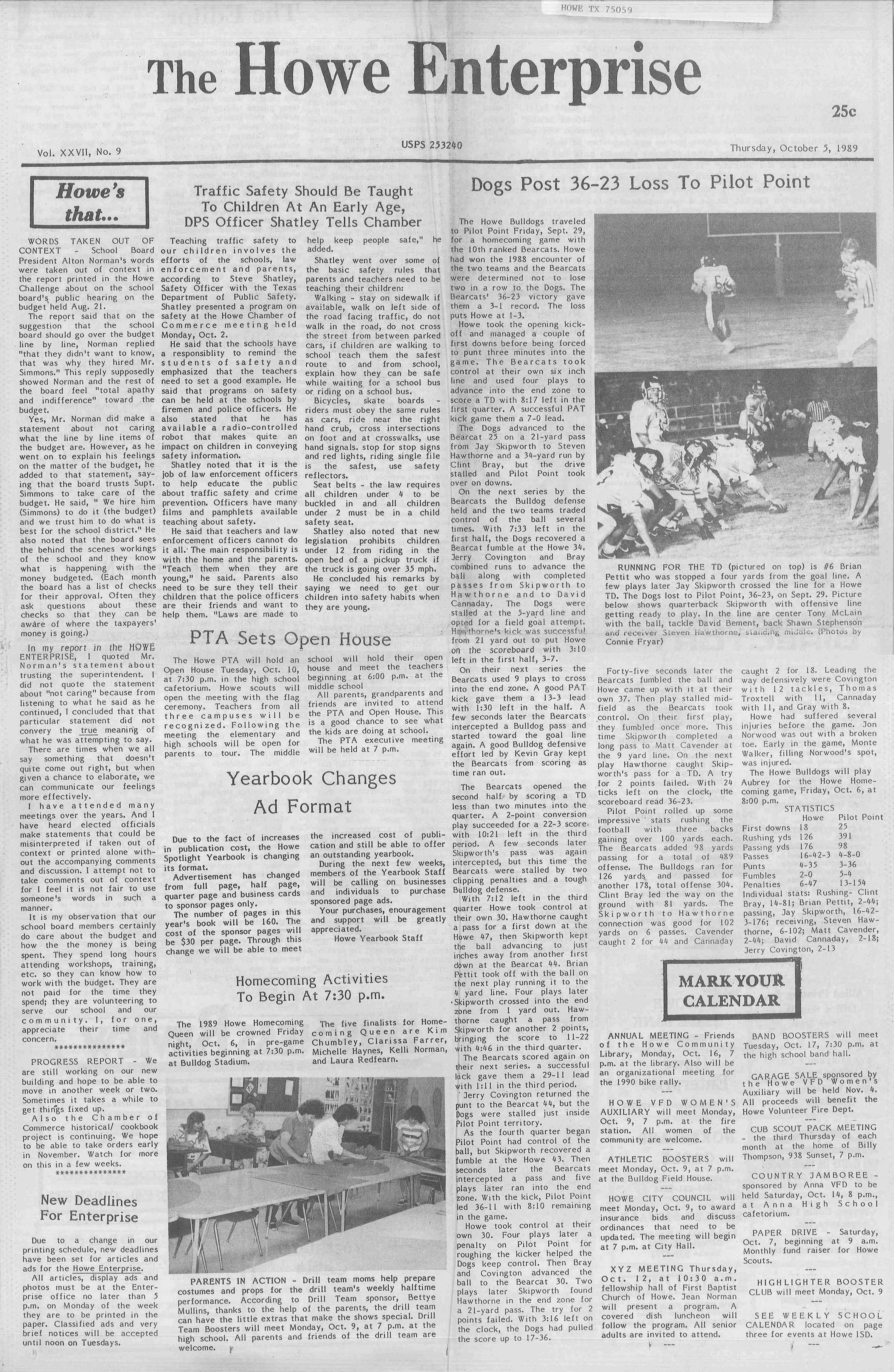 HowewilltraveltoBellsonFriday nightwitha7:30kickofftimeat PantherStadium.ThePanthersare3-3 ontheseasonundersixth-yearhead coachDaleWestandhisslot-T offense.Theirlosseshavecometo Pottsboro,Planview,andGunter.With theirfiveconsecutivetripstothe playoffsandHowemostlikelywithout Ulmer,thePantherswillbeaheavy favoritetowinFriday.IftheDogs continuetheirphilosophyofpounding itoutwiththerungame,thegame couldbethefirstgameinTexaswitha finalscore.