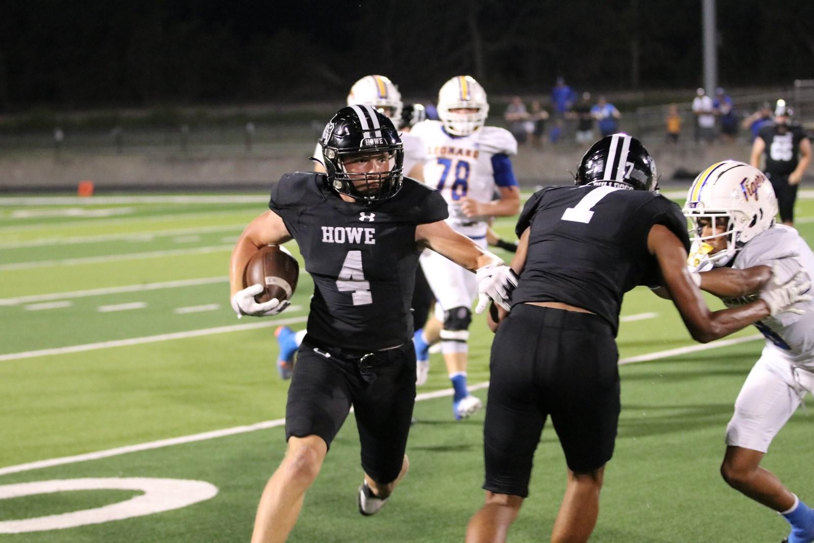 HoweHeadCoachAndrewHarvey’s gameplanwastoputtogetherlong sustaineddrivestokeepLaCook,who hadsixtouchdownsagainstHowein lastyear’smatchup,onthesidelines. TheDogsputtogethera13-playdrive thatcovered75yardsandtooknearly sevenminutesofftheclock.Howegot onthescoreboardwith9:29leftinthe secondquarterwhenUlmerpounced overfromthethreeyardline.The scorenarrowedthegapto14-7aftera JonathanGarciaPAT.ThelargeHowe crowdhadbeenmostlylethargicup untilthatmomentbutarosetofullthroatafterthescore.However,itonly tooksevensecondsforLeonardtoput theLazaruscrowdtosleepwhen Summersraced90yardsonthe ensuingkickofftogiveLeonarda21-7 leadwith9:22remaininginthesecond