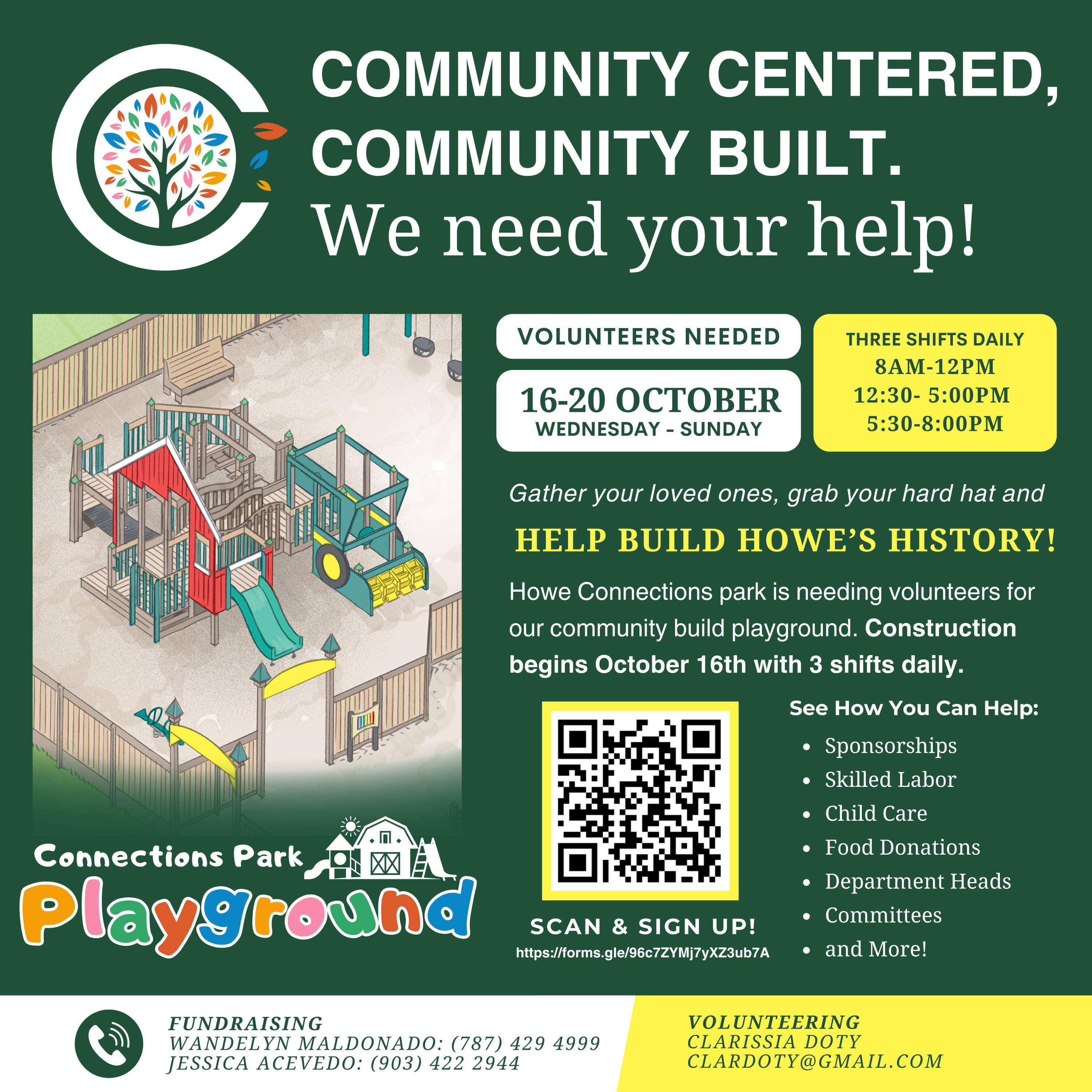 Theanticipatedcommunityconstructionproject willtakeplacebeginning Tuesdaymorningat ConnectionsParklocated alongFM902(E.Young Street)alongthenew BanderaDriveeastof CastlegateSt.Members ofthecommunitywillbe banningtogetherthis weektoconstructafullscaleplaygroundsetwith athemededicatedtothe historicfarmingtradition ofHowe.