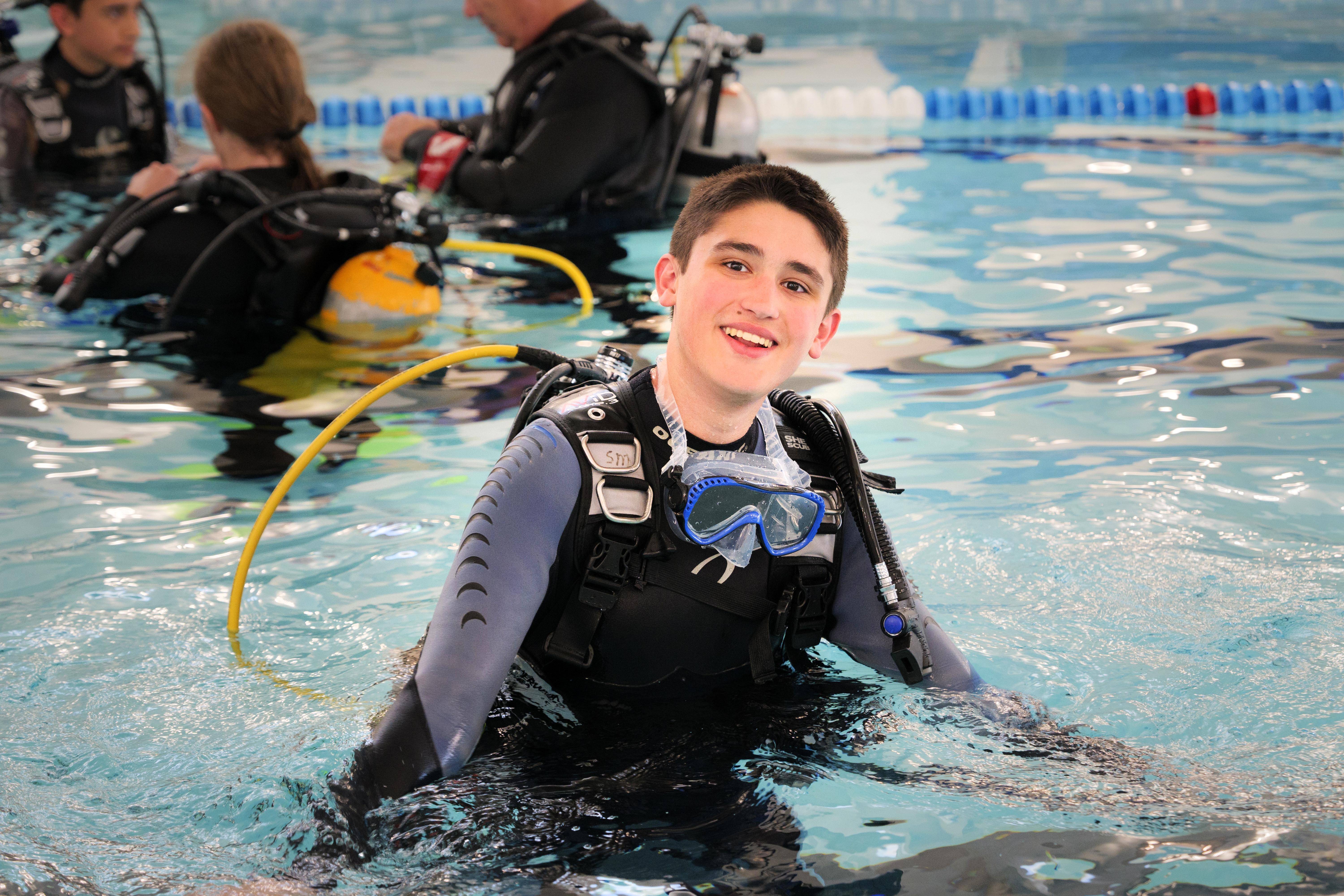 In partnership with Amber Waves, a swimming and scuba diving center in Wichita, Kansas, Cosmosphere campers get to dive straight into hands-on astronaut training. In 2024, both campers and students in the Astro Lab program completed a discovery SCUBA dive in Amber Waves’ pool, preparing them for their simulated mission to the International Space Station.