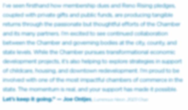 I’ve seen firsthand how membership dues and Reno Rising pledges, coupled with private gifts and public funds, are producing tangible returns through the passionate but thoughtful e orts of the Chamber and its many partners. I’m excited to see continued collaboration between the Chamber and governing bodies at the city, county, and state levels. While the Chamber pursues transformational economic development projects, it’s also helping to explore strategies in support of childcare, housing, and downtown redevelopment. I’m proud to be involved with one of the most impactful chambers of commerce in the state. The momentum is real, and your support has made it possible. Let’s keep it going.” — Joe Ontjes, Luminous Neon, 2023 Chair