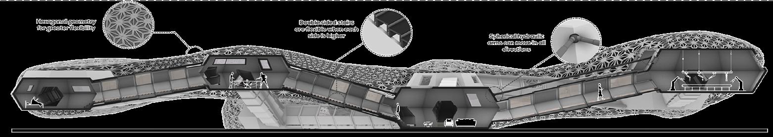 Mars's diverse terrain offers endless opportunities for groundbreaking discoveries, laying the foundation for potential life on its surface. The pursuit of life across the Martian landscape sparks thoughts of habitable environments. A forthcoming mobile surface residence is being designed, featuring modular cells of uniform size to adapt to various topographies. The key objectives are modularity, expandability, and flexibility, allowing for seamless integration into Mars's diverse landscapes. Flexible retractable arms enable the cells to be placed in different terrains, ensuring maximum versatility. Moreover, a secondary shell provides triple functionality: protection from harsh storms and dust, access to sunlight, and efficient use of internal lighting. This innovative design brings humans closer to establishing a sustainable presence on Mars, paving the way for a new frontier in space exploration.