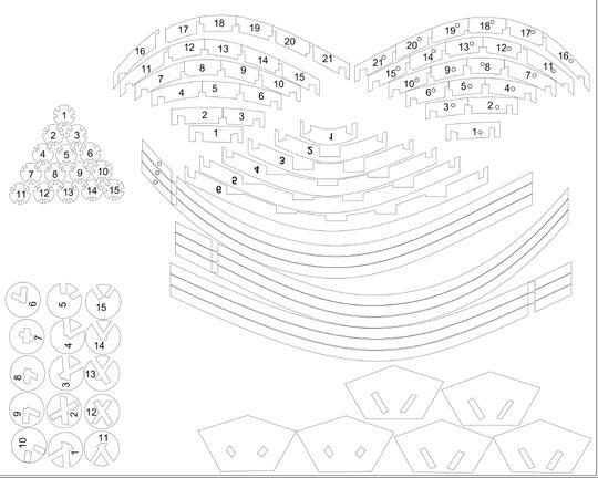 A detailed BIM model was created for digital fabrication, featuring 3D elements. The complex form was divided into expandable strips, consisting of two main layers and a third layer to address CNC limitations. Bending-active structure design required adapted base plates and support. Each element was uniquely shaped and numbered for clarity. Shop drawings generated CNC cutting paths for various material thicknesses: 6mm, 15mm, and 18mm. Experimentation determined 6mm sheets offered optimal bending capability and resilience.