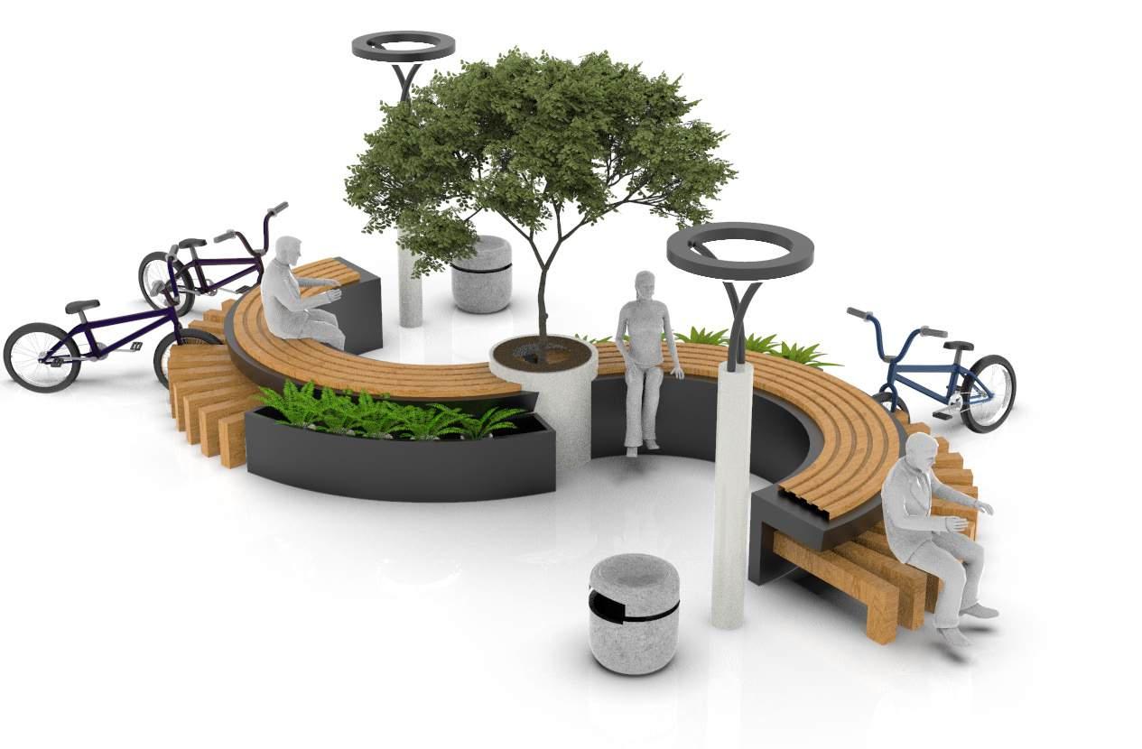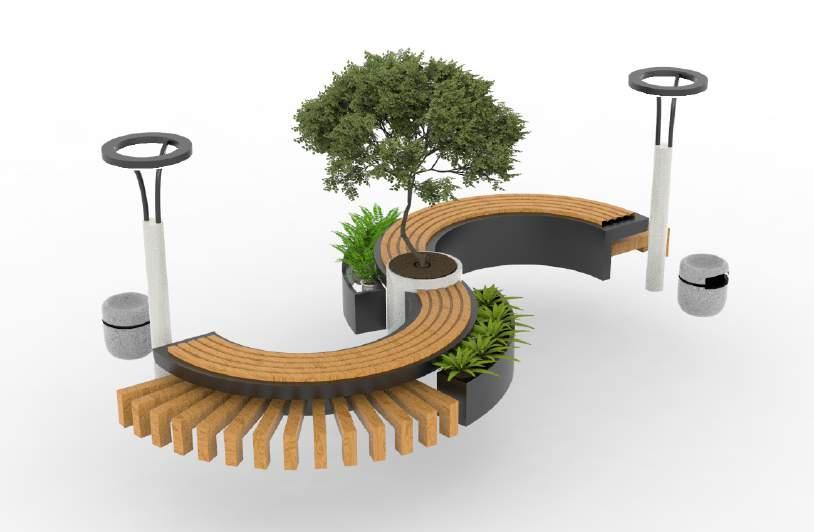 This collection includes various parts, including benches, ,urban lighting, litter bin, bicycle racks, and finally, flower boxes to provide more comfort for users, which is shown in more detail in the image.