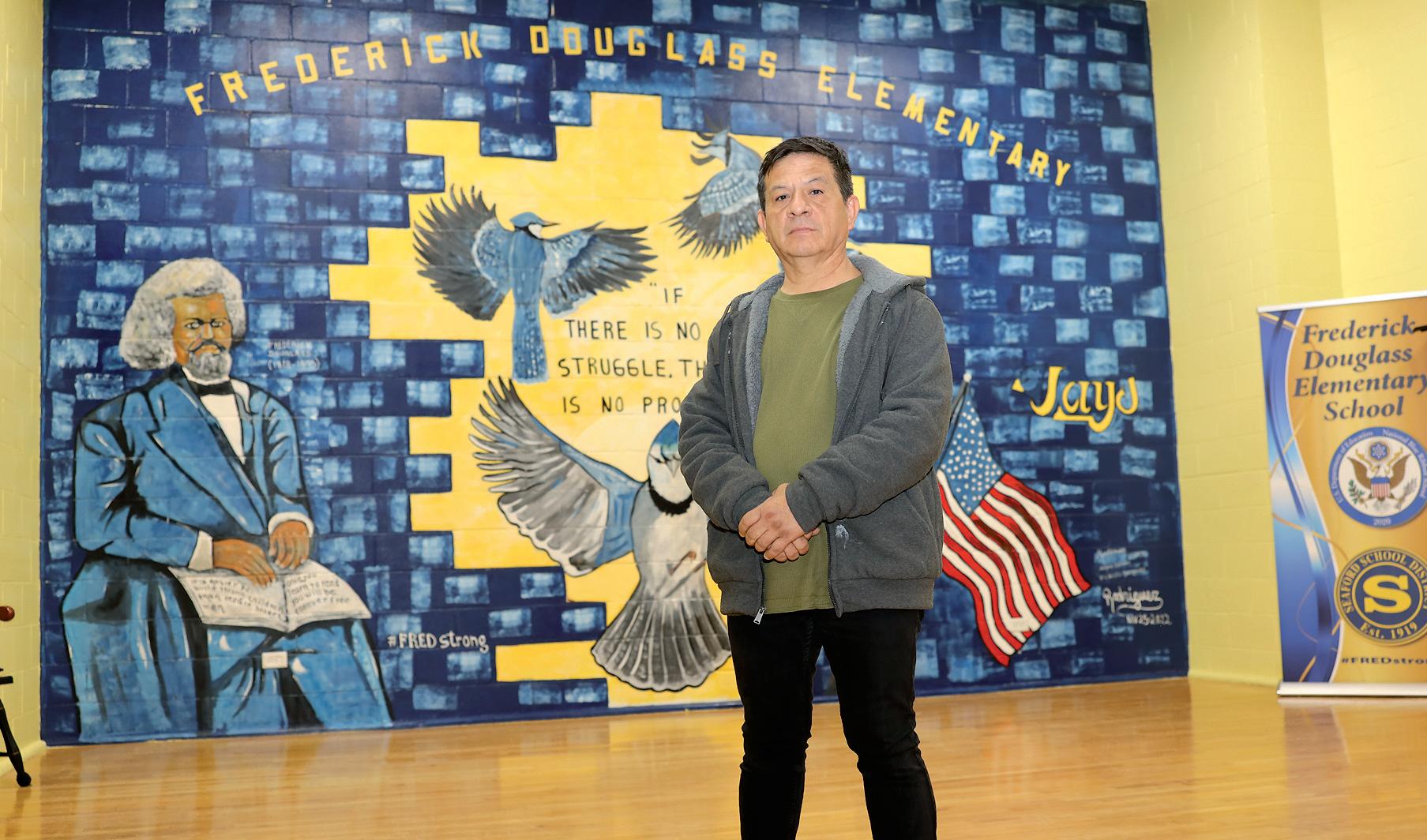 Rodríguez nos explicó los elementos del mural, en el que el político antiesclavista originario de Maryland, y al que está dedicada la escuela, Frederick Douglass aparece junto a una de sus frases, urracas azules –mascota de la escuela–, la bandera de los Estados Unidos y la frase #FREDstrong.