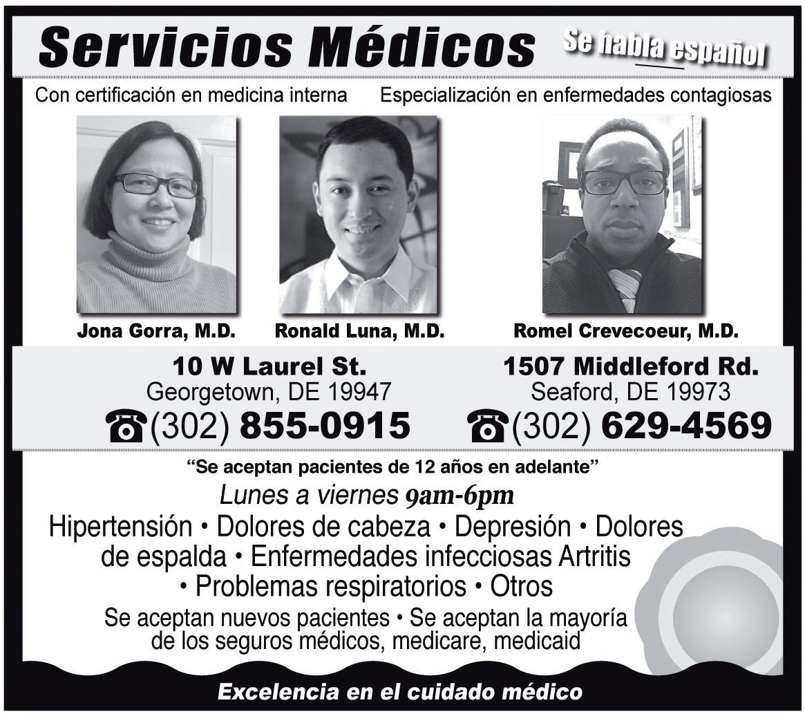 Iglesia Evangelica Famlia de Dios - 223 Adam St., Georgetown. 302-569-1198 • 302-337-9701. Pastor Asrael Soto. Servicios: S 5pm; D 5pm; M 7pm oración en hogares; J 7pm enseñanzas.