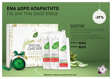 -27 % Aloe Vera Box Ειδικής Περιποίησης | 20650 Τρία προϊόντα εντατικής φροντίδας που προστατεύουν την επιδερμίδα με υψηλή περιεκτικότητα σε Aloe Vera και πολύτιμα φυτικά εκχυλίσματα. 20601 Ενυδατικό Συμπυκνωμένο Gel | 100 ml + 20602 Προστατευτική Κρέμα με Πρόπολη | 100 ml + Σπρέι Άμεσης Δράσης | 150 ml (ειδική συσκευασία που διατίθεται μόνο με το Box)
