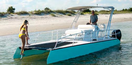 include all-welded marine aluminum construction in a variety of custom colors, foamfilled hulls, custom Dek-it underfoot, beach chair storage with cooler, fully appointed, shaded helm with four rod holders, seating for six, hidden swim ladder and a trampoline that simply looks fun to hang out (fish?) on.