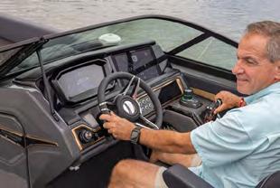 The Lusso line has a new helm that includes a 12-inch touch screen in place of gauges, making it similar to the Leggera helm. There is also a new battery switch located at the helm that is standard. Improved standards include the new mounting location for the depth finders (an improvement for all Barletta models), dimmable dash, improved Lusso steering wheel, new Onyx furniture accent and new dash panel surround accent. All engine options now include Simrad integration too.