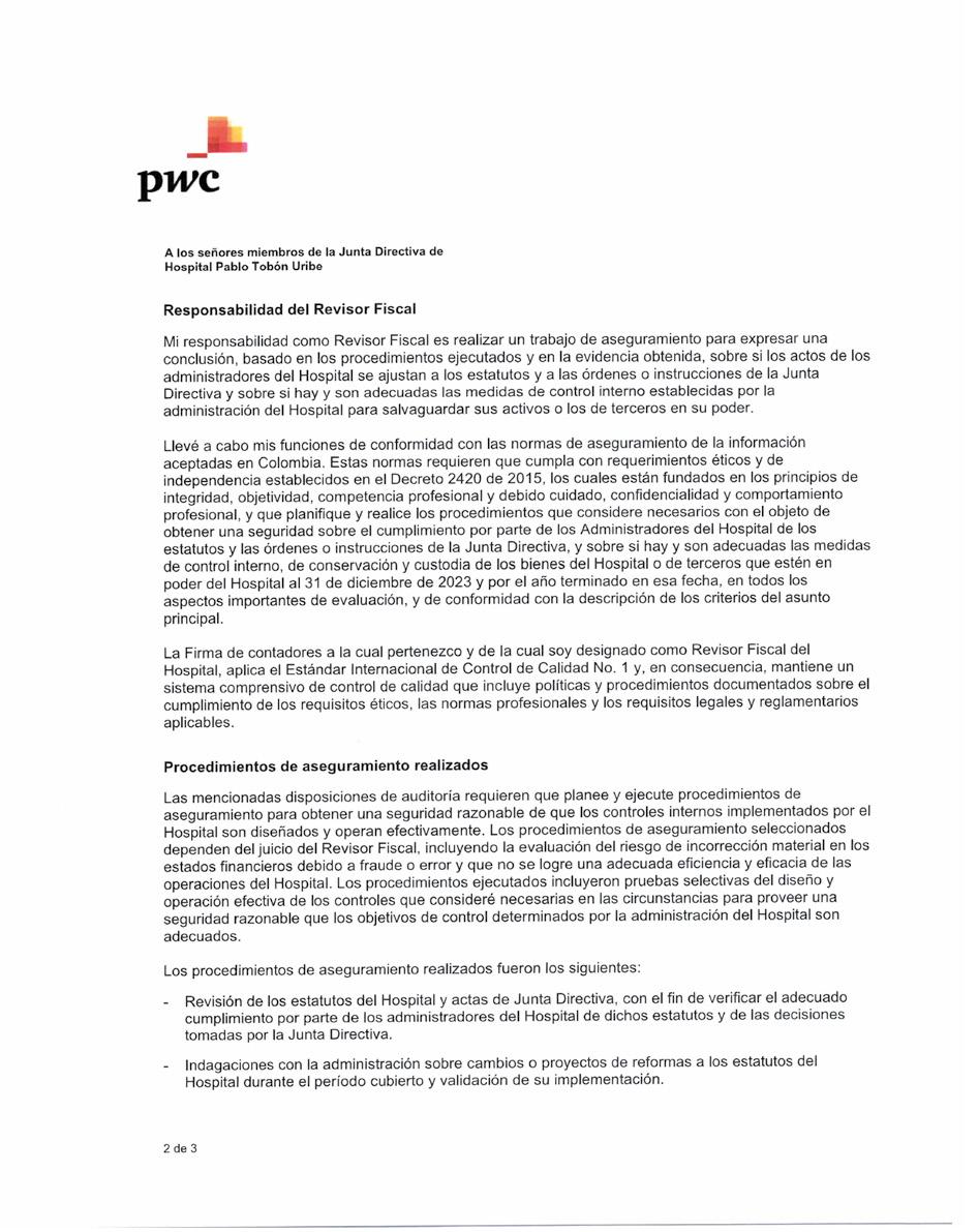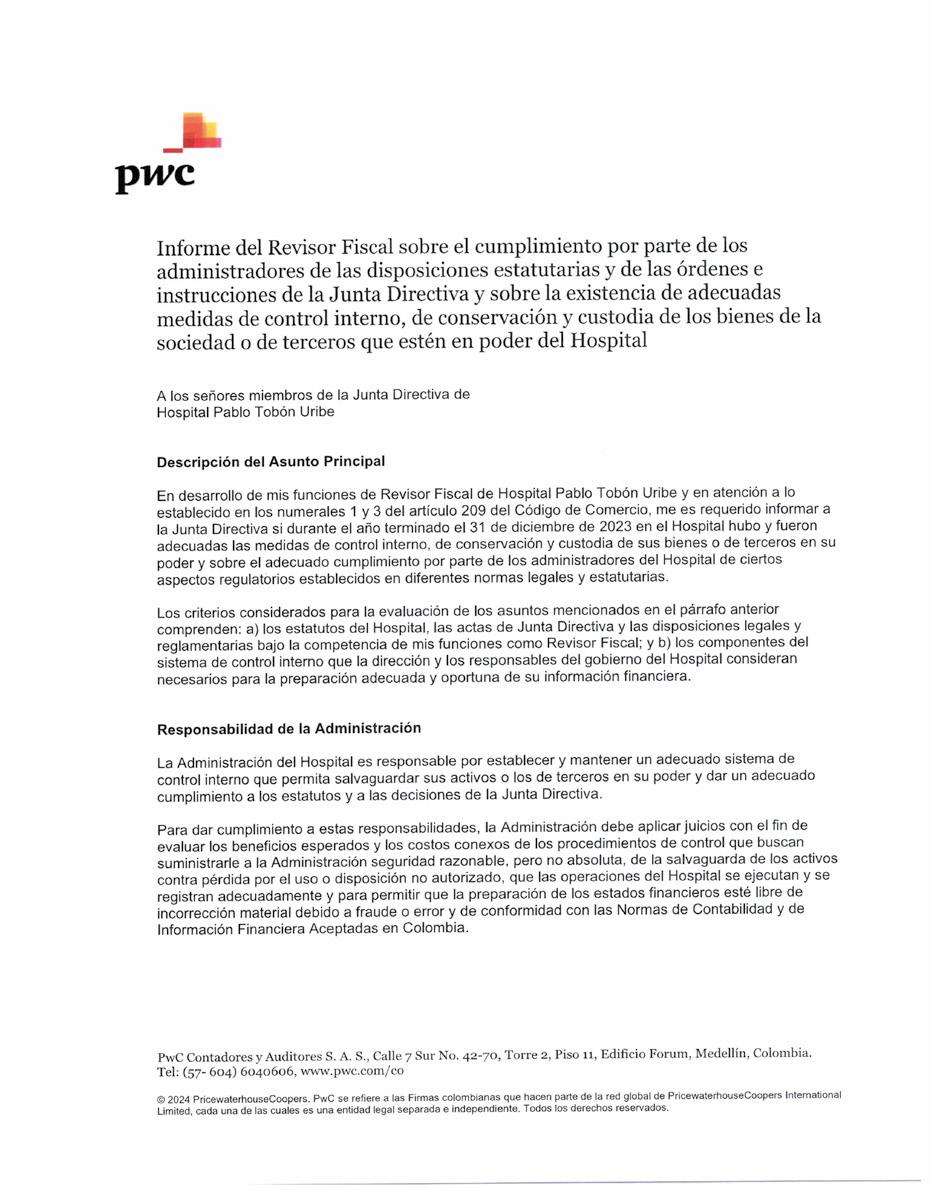 INFORME DEL REVISOR FISCAL 04 COMPROMISO FINANCIERO CON LA SOSTENIBILIDAD DEL HOSPITAL 217 Pag. H o sp i t al Pa bl o To b ó n Uri b e @h o s pi t a lp ab l oto b on uri b e @H o s pi ta l Pa bl o Tobon Uri b e Ho sp i t al Pa bl o To b o n Uri b e @ HPTU