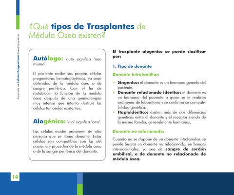 • Singénico: el donante es un hermano gemelo del paciente. • Donante relacionado idéntico: el donante es un hermano del paciente a quien se le realizan exámenes de laboratorio y se confirma su compatibilidad genética. • Haploidéntico: existen más de dos diferencias genéticas entre el donante y el receptor siendo de la misma familia, generalmente hermanos. Donante no relacionado: Cuando no se dispone de un donante intrafamiliar, se puede buscar un donante no relacionado, en bancos internacionales, ya sea de sangre de cordón umbilical, o de donante no relacionado de médula ósea.