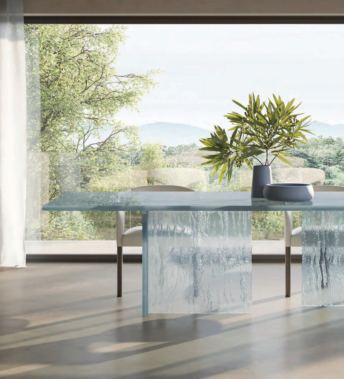 Reflex of Italy, available exclusively at Sarsfield Brooke. Laguna table, designed by Riccardo Lucatello. Layers of handcrafted Molten glass of irregular surface and texture fused together for strength and beauty.