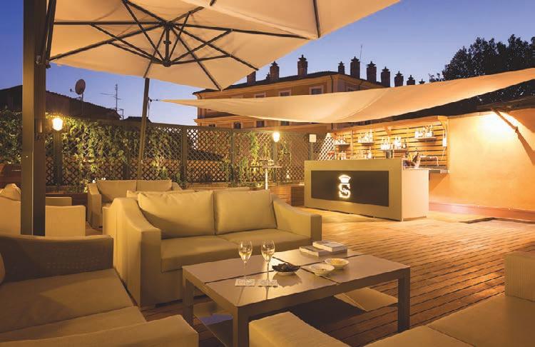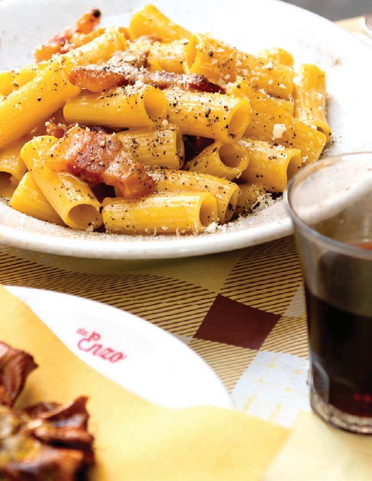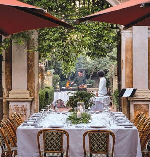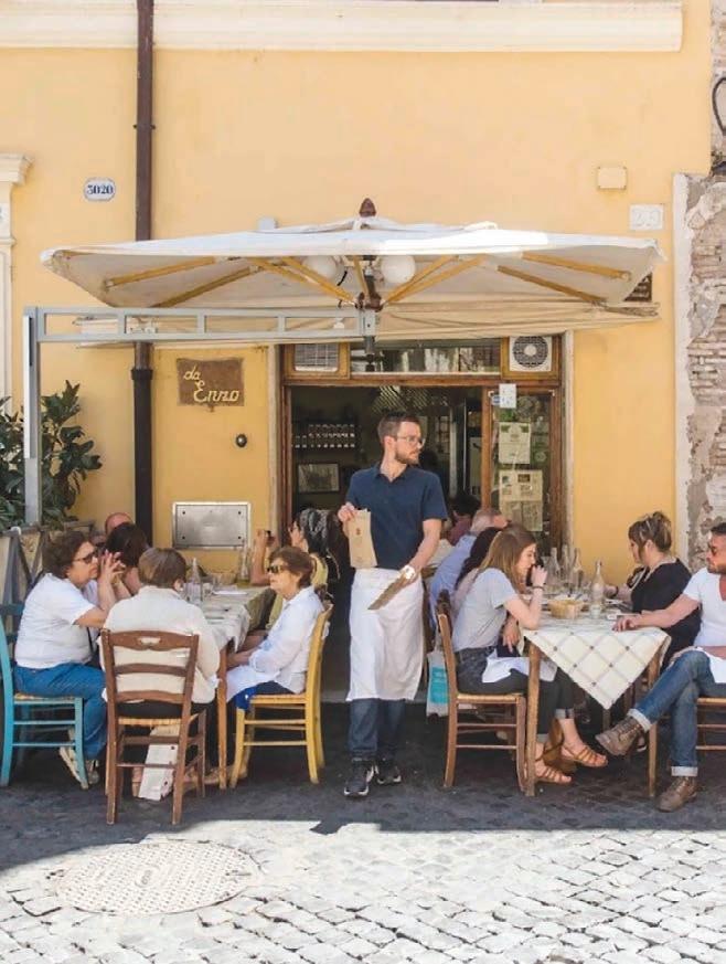 OPPOSITE PAGE: One of the elegant salons in ancestral Villa Spalletti Trivelli, now a small boutique hotel; Villa Spalletti Trivelli’s stunning rooftop by night; a classic Roman trattoria, Da Enzo, is perfect for lunch.