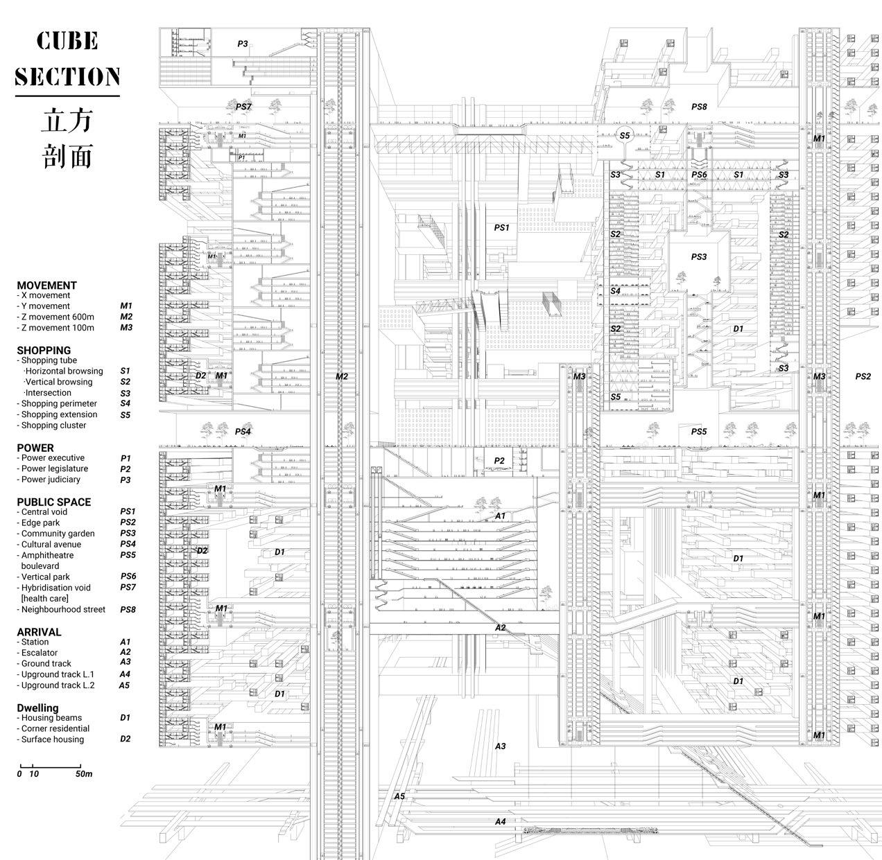 Then, for the purpose of solving the isolation of these zones and permanently keeping the intensity of time into small areas, the idea of temporal ‘compression’ is proposed. This approach of compression manifests in a design proposition a radical and direct solution in order to solve problems that cities like Shanghai have. Under this city prototype, there are six individual projects focused on what we call different ‘attributes’ – dwelling, shopping, public space, power, arrival, and movement. All attributes should be reconsidered in response to the new urban organisation.