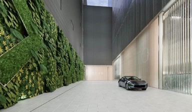 With cars passing through a terracotta portal, a lane bordered by green walls, terracotta, movable plants, and water curtains, and reaching the southern drop-off area surrounded by a waterlily pond and a grand fountain waterfall.