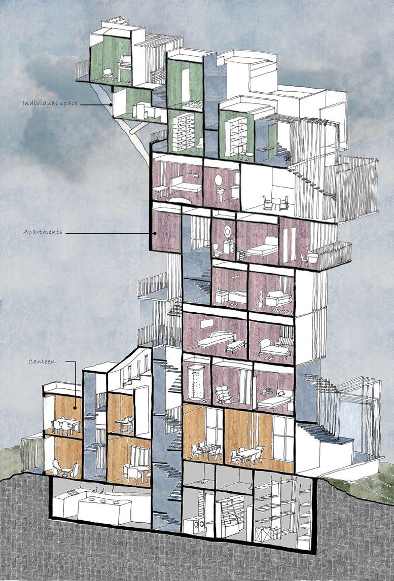 Usually the Chinese student dormitories only provide the essential requirements for living. However, we are living in a period in which everyone enjoy expressing own personality, so this project attempts to create a new living space for student to accompany with their living styles. The design comes from the imagination of a series of ways people living, eating and communicating. The imaginary scenes lead the whole design process.