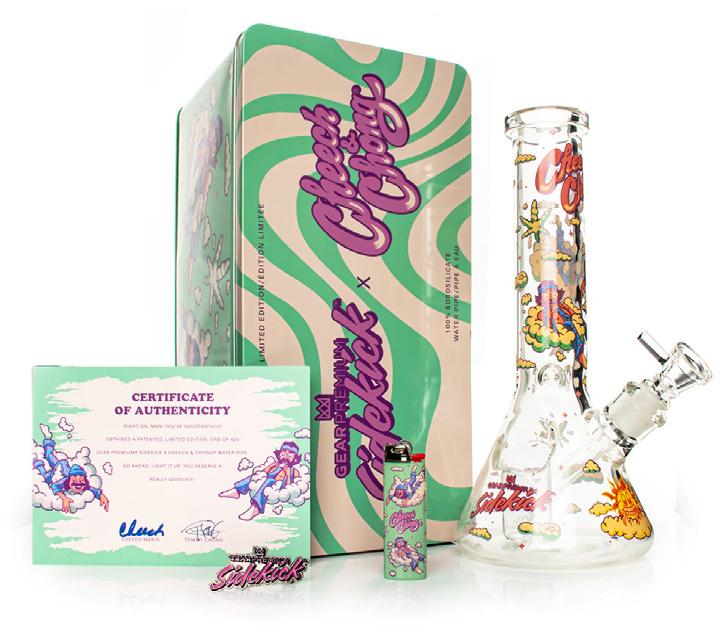 “My Homies” Sidekick Water Pipe, a special edition GEAR Premium® x Cheech & Chong® collaboration, and a homage to the Legends themselves. Standing 12” tall and designed with a 7mm thickness, the Sidekick combines durability with a classic but caricatural aesthetics. Accompanied by a matching lighter and pin, and presented in a collectible tin featuring art by Hood Van Gogh, this set goes beyond utility to become a piece of art. This limited collection, with only 420 crafted, offers a once in a stoner lifetime experience, but you might want to keep this one in the box, as any respectable collector would. Each water pipe is individually numbered and paired with a certificate of authenticity signed by Cheech & Chong, making it more than just your regular accessory —it’s a piece of history.