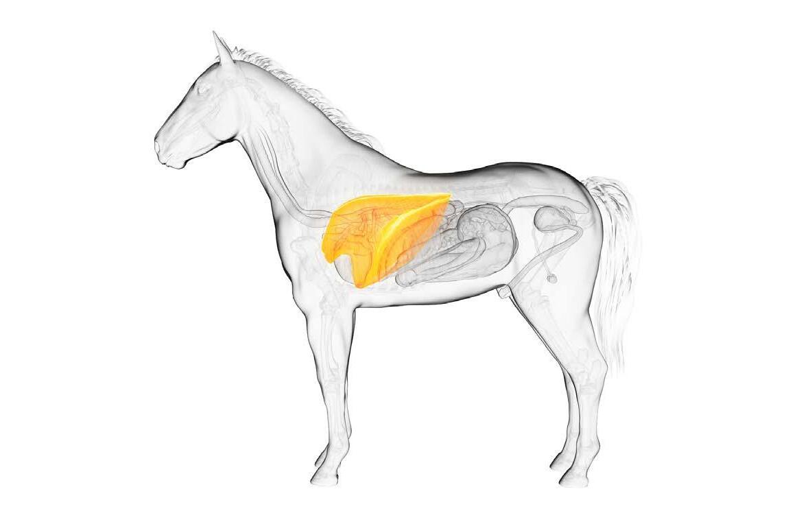 The pharynx is a chamber at the back of the throat. Both the oesophagus and the trachea open into this space. The epiglottis (a large leaf-shaped piece of cartilage) and the soft palate (a long muscular piece of tissue attached to the hard palate) are therefore needed to prevent food from entering the lungs during eating. When the horse is breathing, the trachea is open to allow the free passage of air; the soft palate is hooked back behind the apex of the epiglottis; and the oesophagus is closed by the arytenoid cartilages. When the horse is eating, on the other hand, the muscles at the root of the tongue lift up each time he swallows a mouthful of food. This pulls the larynx forward and down so that the apex of the epiglottis can seal the trachea. At the same time, the soft palate moves upwards to open up the oesophagus; this also seals off the nasal passages.