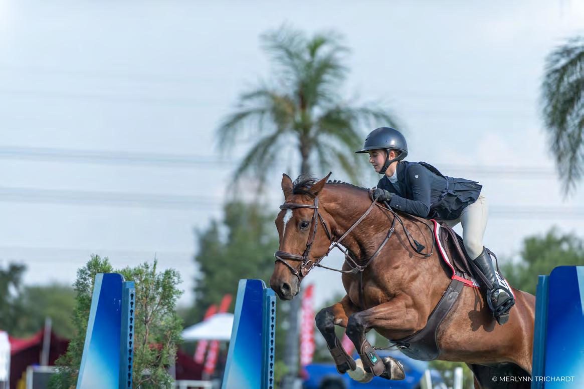 Once again, Anna-Marie Esslinger set a big and challenging track for the title class. Anna made use of the vast length and width of the Bob Charter arena, building several longrelated distances, which required accurate riding and responsive horses. The most challenging of these lines in the first round proved to be the Open water at number 4 on eight strides to a double at 5, jumping in over a vertical at 5a and out over a big wide oxer at 5b. While the wide oxer at 5b caught a few horses, most penalties came from the vertical at 5a, likely related to the open water jump beforehand.