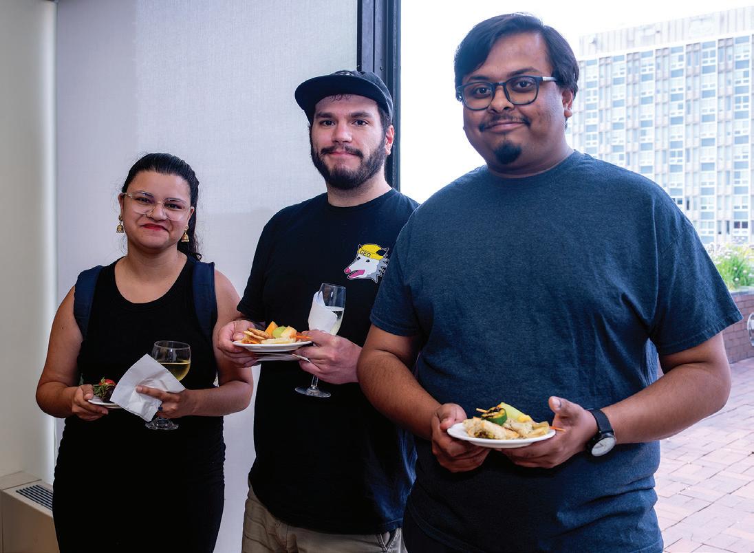2023-24 HRI Graduate Fellows Alexandra Sundarsingh, Adam LoBue, and Soumya Dasgupta at prizes ceremony and closing reception.