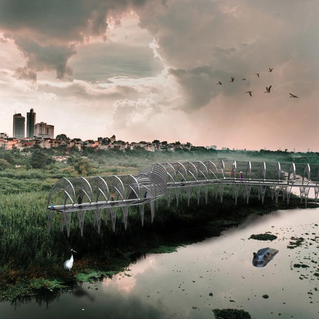Adapting itself to the outside the elements have now changed, the wooden frameworks steps aside and in its place, metal galvanized pipes are pre-bent and fitted into metal joinery tubes. The whole framework is now the leaning element, bent by the change in perception brought on by the impact of disappointment. The verticality is no longer there, now flat on its’ side the architectural implementation is a platform for viewing the world: the natural, wild flora and fauna near Hanoi City, Vietnam.