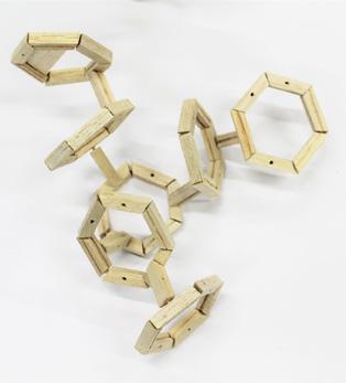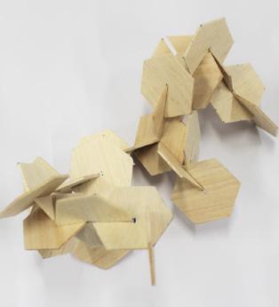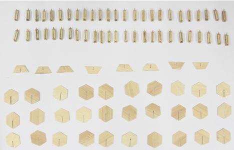 To start off the project, the task of constructing a FOLLY set was given. In the construction set there are two primary units: the first is a radial cut platform, the variations in this grouping is formed by adding additional 60 degree radial parts to the previous. Together they build a honeycomb. The second grouping of pieces consist of slat cuts with an indentation on the long sides to allow the aforementioned radial cuts to fit in snugly. The constructor was built with Balsa wood.