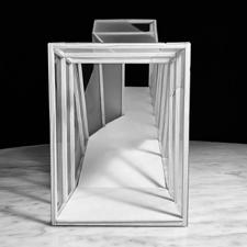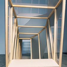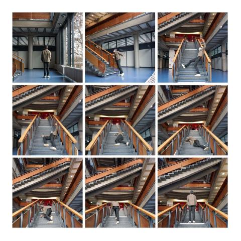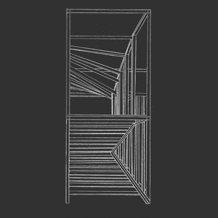 The chosen design is constructively split into multiple wooden frames, dissecting the 5 meter span into 9 spatial fragments. The viewer / actor must tread upwards, not knowing what is behind the transfigured corner in the middle of the piece. This same middle is the epicenter of the emotional change and as such draws the eye towards it. Metaphorically the point of no return, where one must come to face reality and rise up to the new real.