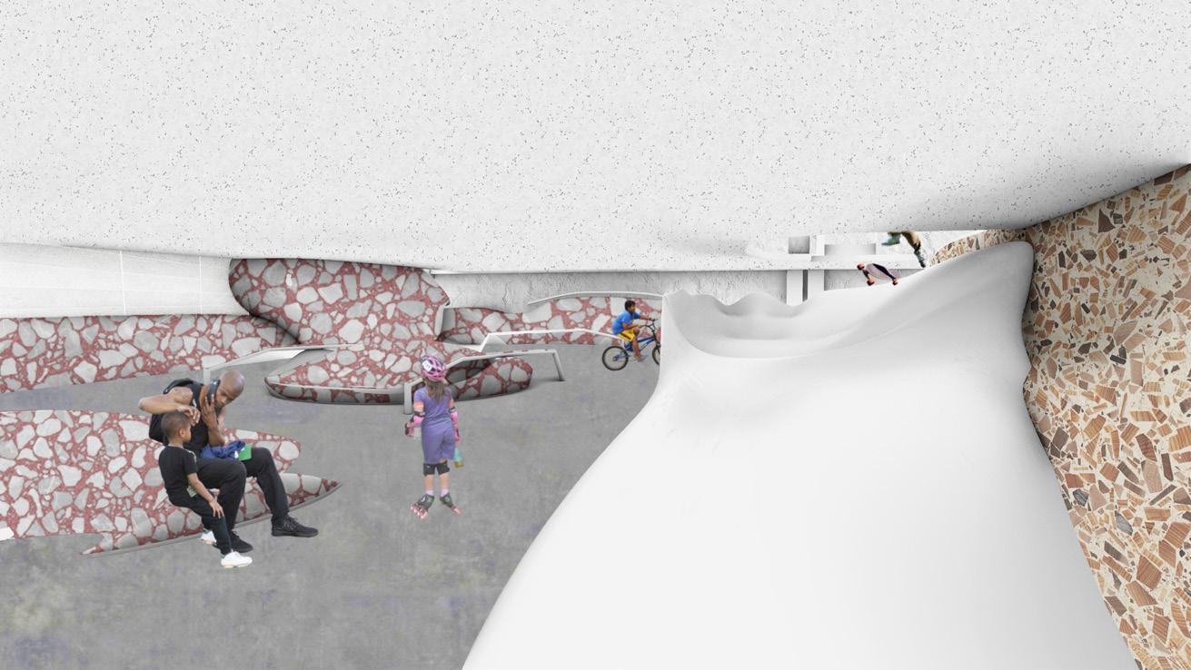 The concept is influenced by the history of skating as a sport, focusing on using old derelict swimming pools, to which Alvar Aalto can be credited as introducing the skate bowl in the early 1930s. One man’s trash is another man’s treasure and skating encompasses this idea perfectly. The main pool is converted into a skate bowl, having connections to the outside and to the basement via ramps. The small pool is preserved as is, divided by a colonnade and glass, and kept as a place of comfort and rest, providing a safe space for teenagers.