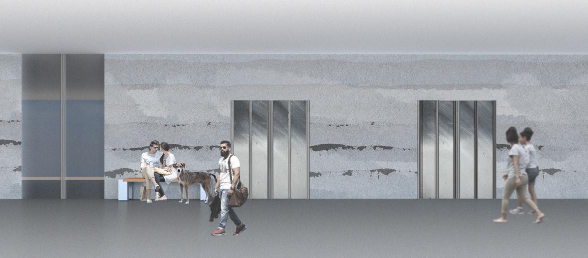 The floor plan has been reconfigured to expand on the number of stalls, sinks and urinals by multiplying them x2. A total of 16 toilets, 2 handicapped stalls, 8 urinals and 12 sinks. The circulation allows fast and straightforward crossing from the north passenger walkway and the south before-flight waiting area.