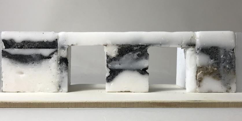 For the walls a mixture of aggregate, sand, soil and concrete would be used as this material accounts for over 75% of all building waste generated. After being ground up to varying degrees of fineness these particles will be bound together by clay.