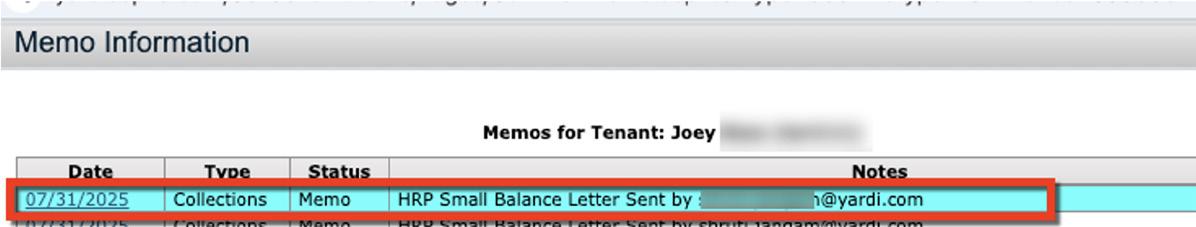 It will also automatically generate a memo with the date the late notice was sent , the type of late notice and the user generating the notice. This memo is going to auto default to “Collections” Memo type. This is necessary in order for the memo to reflect on the Resident Delinquency Summary w/Memo’s Report: