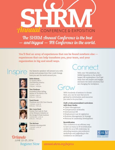 With hundreds of sessions to choose from, you can be sure that you’re getting the information and resources you need to be your best. Craft a truly personalized curriculum with these tracks: • Talent Management • Compensation & Benefits • International HR • Employment Law & Legislation • Business Management & Strategy • Personal & Leadership Development Recertification This conference is an efficient way to earn as many as 49 recertification credits for your HR credentials, by attending sessions, preconference workshops and upgrading to the Conference on Demand!