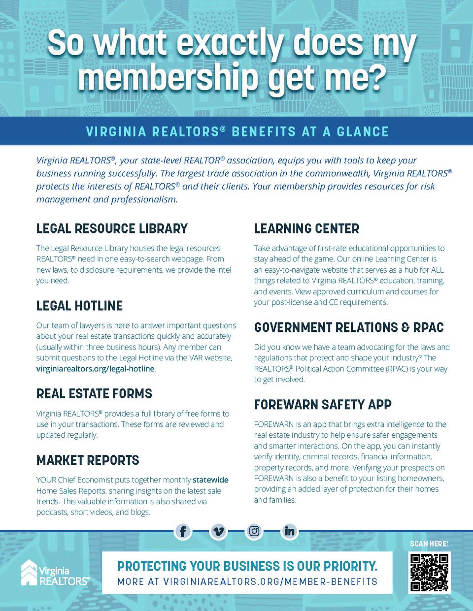 The three-way agreement, wherein a member must join all three levels of organized real estate the local, state and national is so incredibly powerful because there are 1 4 million members all in lockstep promoting the protection of private property rights and the profitability of the brokers and agents. The resources and influence of NAR flow down to VAR and then to HRRA. Your benefits start at HRRA with local research, local data, local news, local networking, targeted local education, and local advocacy. They then flow up to VAR where they are amplified by a phenomenal lobbying team helping to shape the laws that guide Virginia members, a legal hotline, a tech hotline, and a safety app with national data. The work of VAR is then informed by national trends, national research, and most importantly, the advocacy work of our national advocacy team. The three-way agreement means three time the power to propel member success
