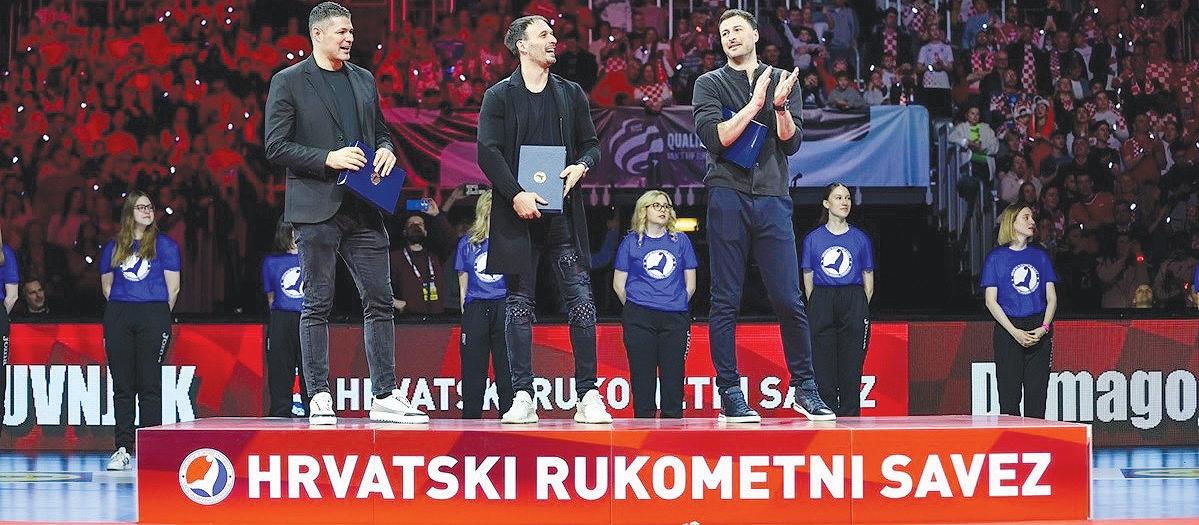 HRS je za sve njih pripremio lijepu plaketu s popisom svih 16 medalja koje su hrvatske rukometašice i rukometaši osvojili. Završni segment cijele priče bio je oproštaj tri hrvatske rukometne legende: dugogodišnjeg kapetana Domagoja Duvnjaka, Igora Karačića i Ivan Pešića. Za svakog od njih je bio pripremljen poseban kratki podsjetnik kroz �ilmske isječke iz bogate karijere, te su uz taktove odabrane pjesme prošli kroz špalir igrača s kojima su donedavno dijelili reprezentativnu svlačionicu. Duvnjaku, Karačiću i Pešiću su predstavnici veterana gardijskih brigada dodijelili posebne zahvalnice, a legendarnom kapetanu je uručena i hrvatska zastava koja se tijekom posljednjeg Svjetskog prvenstva vijorila na Kninskoj tvrđavi.