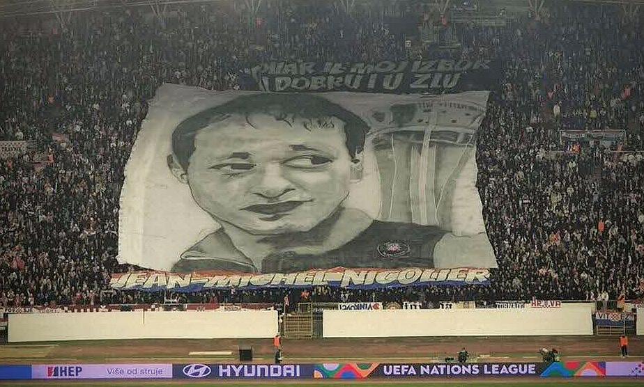 “Hrvatski navijači odaju počast francuskom vojniku tijekom utakmice Hrvatska-Francuska. Francuski vojnik Jean-Michel Nicolier pretučen je na smrt, a zatim i strijeljan 20. studenoga 1991. tijekom masakra u Vukovaru kada je imao 25 godina.