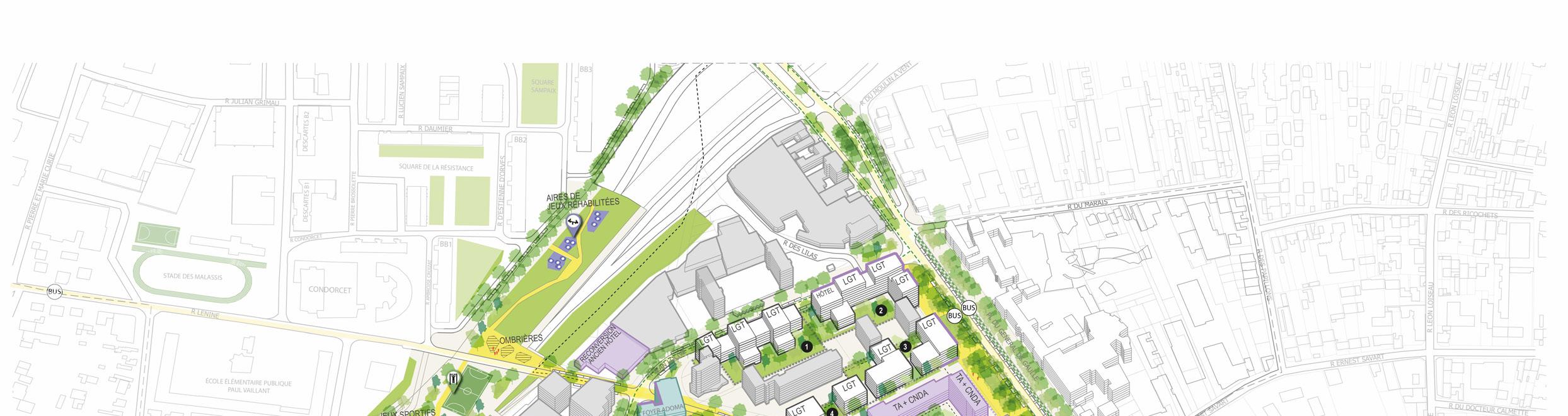 • Démolir certains logements et équipements et construire plus densément dans le quartier. Une grande partie de ces nouvelles constructions prévoit l’arrivée de nouveaux logements. Les équipements existants sont relocalisés dans de nouveaux locaux, et un nouveau gymnase est créé.