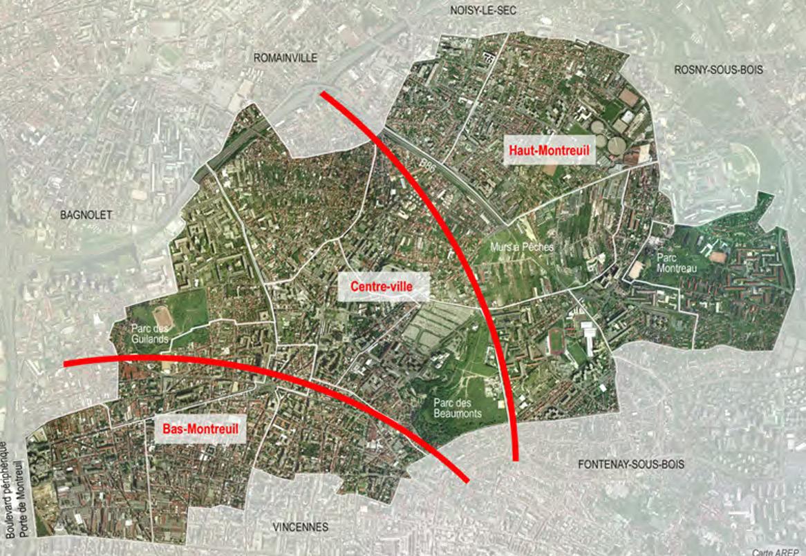 Les 3 entités géographiques de Montreuil. Carte AREP.