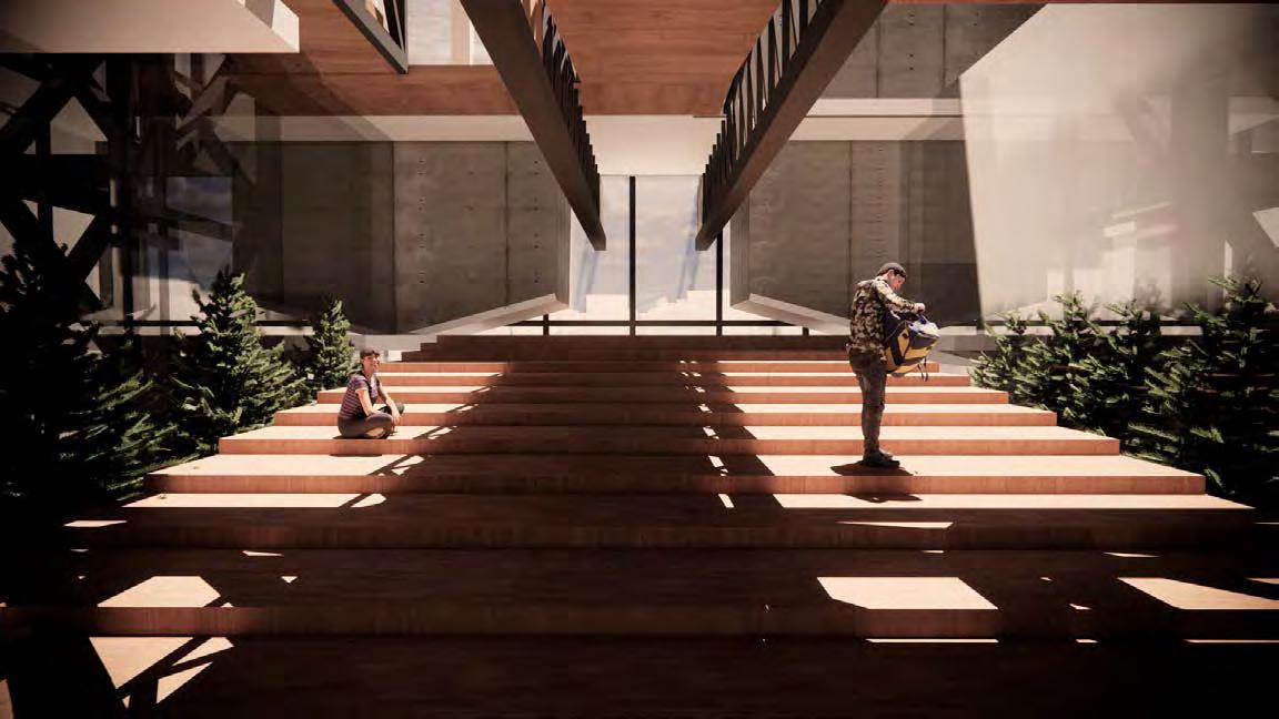 This section shows the materiality of the sauna. It also shows how people inside can have a view of the trees outside and how the light brought in from the atrium is different from the light brought in from the roof. This also shows openings in the roof in between programs, which is there to provide sunlight to the vegetation existing there, making it available for viewing by the people inside and activating these spaces that otherwise would have gone unused