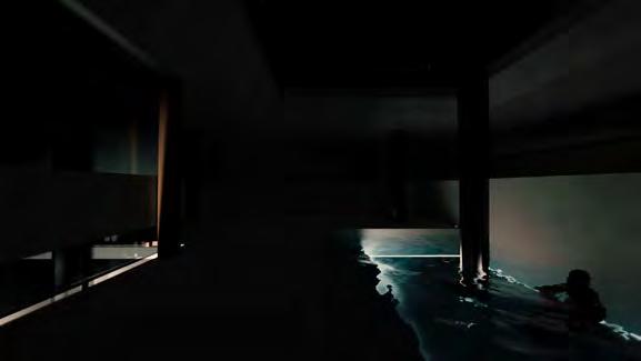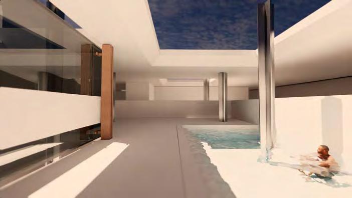 As you can see, the roof openings in the pool are not just cut-outs into the roof, but are actually curving in and out of the roof. This helps in completely cutting out the view of the surrounding buildings. This also helps in guiding the eyes of the occupant in a sort of angled way and is able to have complete control over the view of the occupant during the night showing only specific constellations. In the day, you can see that the sunlight guides the occupant directly into the pool and has the ability to set the tone of the spaces at different times of the day, with its deflecting angles and shadows, which would not be possible with a simple atrium which floods the room with light.