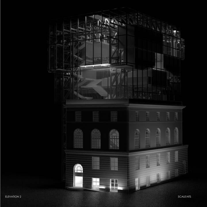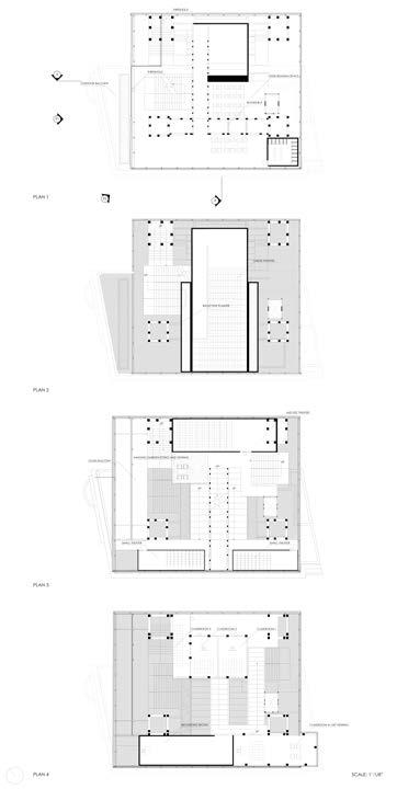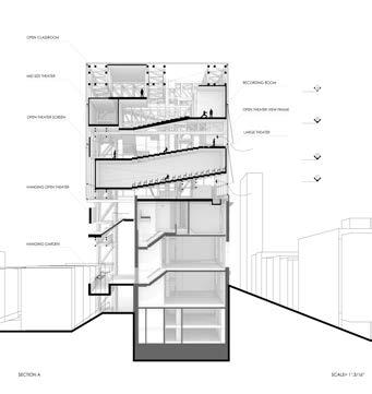 The ground floor consists of an open performance space, where musicians can hold performances on a large scale, and also have scattered glass boxes where people can come in from the street and practice their music, either privately or in a group